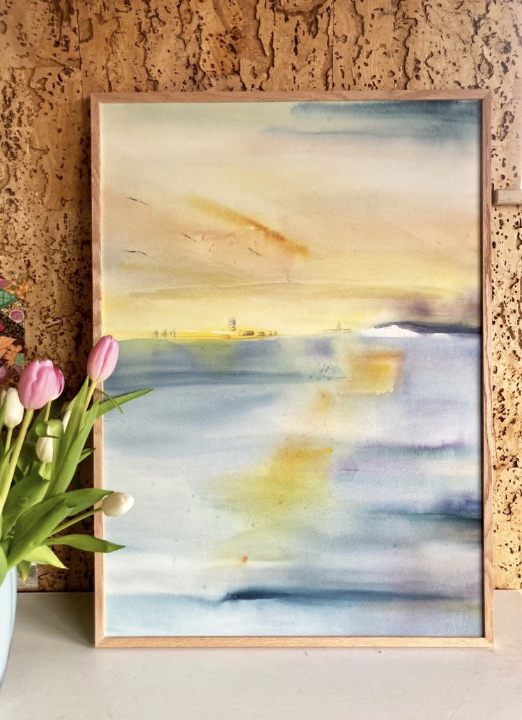 Original Malet med akvarel 30 x 40 cm Inklusiv smal ramme i massiv eg Originalen er signeret